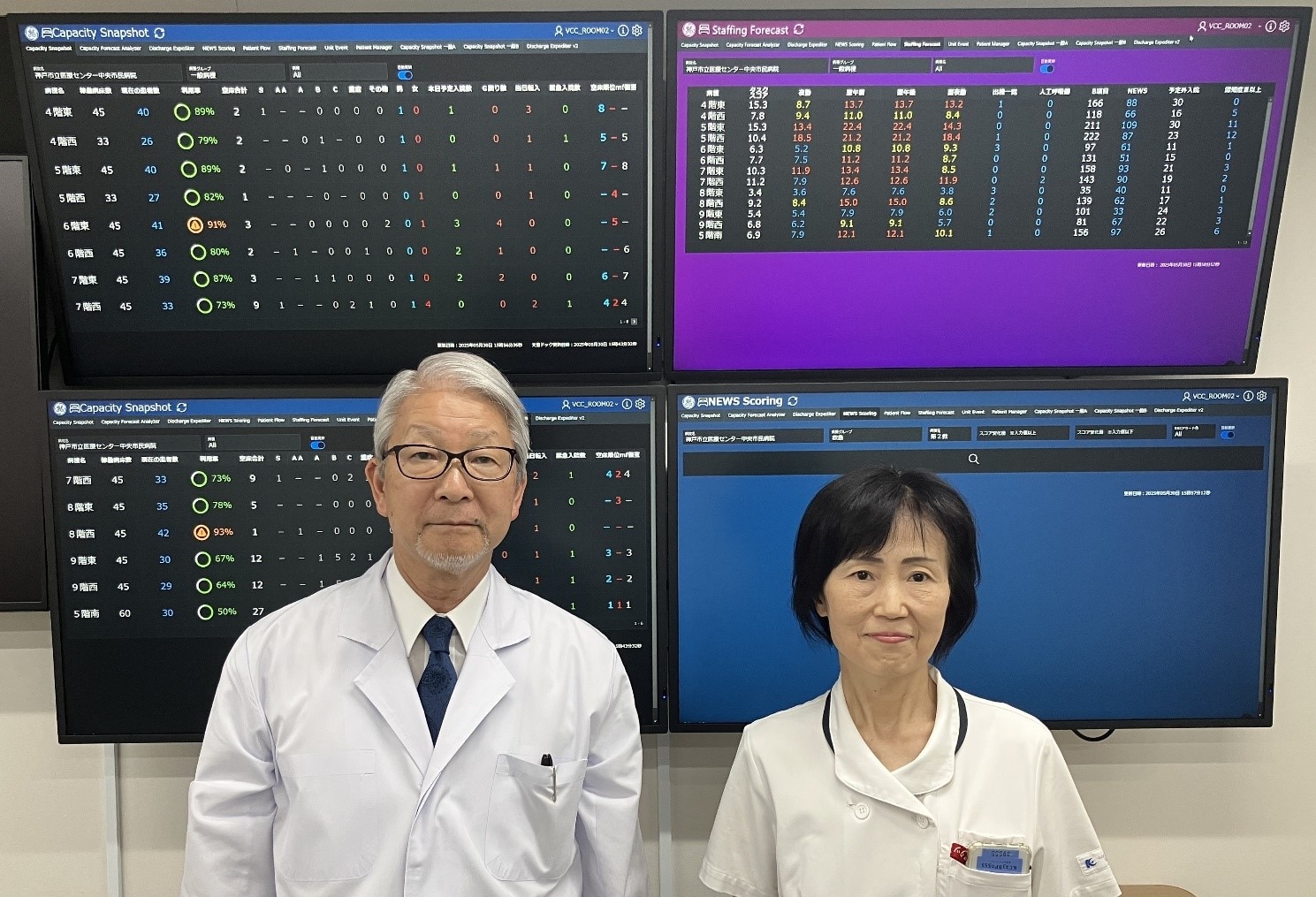 図)「ボリュームコントロールセンター(VCC)」にて。左:病院長 木原康樹 右:副院長兼看護部長 藤原のり子