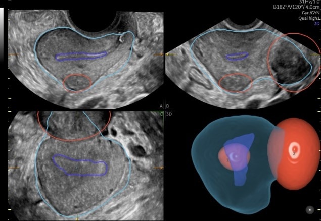 Volusonが長年培ってきた3D技術と、開発へのAI活用により、婦人科超音波検査の効率化に貢献する2つのアプリケーションを搭載しました。1つは、少ないステップで子宮筋腫の立体的位置関係を可視化する機能で、これまで断層像を用いて立体像をイメージしながら実施していた検査を3D画像化することで、簡便に子宮内膜との位置関係や、大きさを把握できるようサポートします。(画像➀)