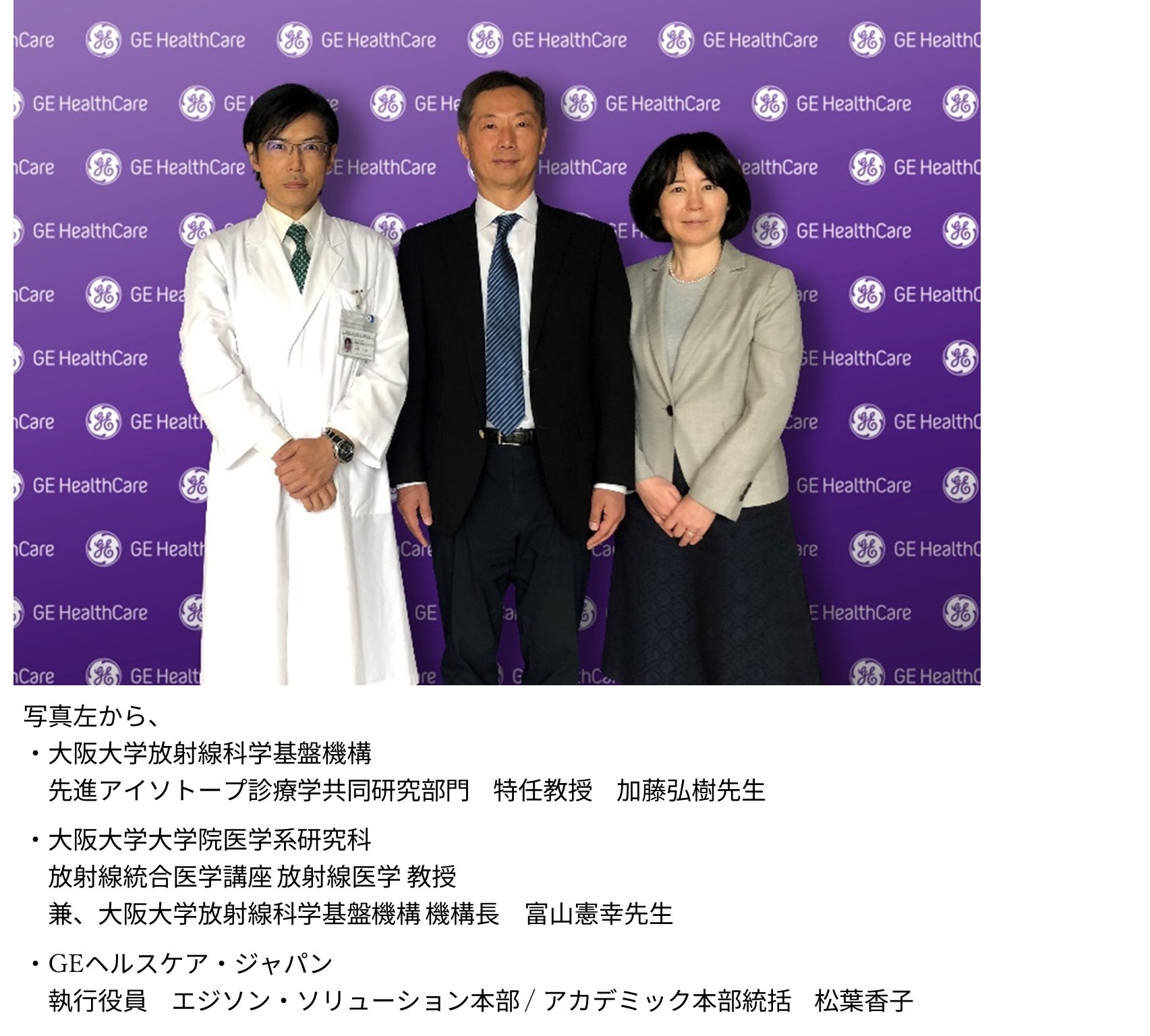 大阪大学の放射線統合医学講座放射線医学、富山憲幸教授は次のように述べています。「GEヘルスケア・ジャパンと共に包括共同研究契約の下で、これまで様々な共同研究を展開してきました。その中でも、標的アイソトープ治療のためのセラノスティクスは、臨床、研究開発の両面において、核医学診療科、放射線診断科では特に注力している重要な分野の一つです。放射線科学基盤機構は分野横断的な部門であり、様々な専門領域の研究者が共同してアイデアを集約した先進的薬剤研究開発を行ってきました。ここにGEヘルスケアの持つ高度な画像診断技術を融合させることで、さらにセラノスティクス研究が加速するものと期待しております。」