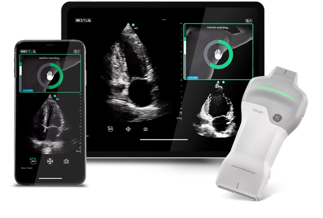 GEヘルスケアの「Vscan」シリーズは、患者さんにとって体への負担の少ない非侵襲で、かつ場所を問わず簡便に画像診断を可能にする手のひらサイズの超音波診断装置(ポケットエコー)です。日本では、2010年の発売開始以来、聴診器のように持ち運べる手軽さと患者アクセスの良さから、これまでに国内で約15,000台以上の販売実績を誇ります。2021年にはワイヤレス化を実現し、今回2つのAI機能を初搭載した「Vscan Air SL Ally」は、同シリーズの最新モデルです。