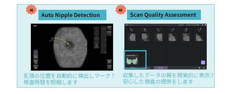 AI技術を取り入れた新しい機能*は、検査時に乳頭の位置を自動的に検出し、取得したボリュームデータの撮影範囲やスキャンの品質などを視覚的に表示します**。また、撮り忘れ防止のサポートや自動化による医療従事者への作業負担の軽減でスムーズな検査環境に寄与します。その他、ハードウエアの刷新でスキャン速度が従来より約40%***短縮し、検査時間の削減にも貢献します。