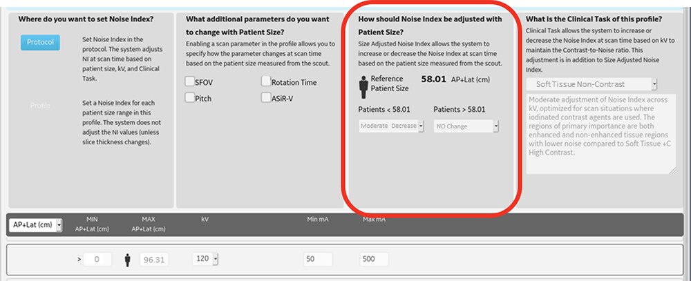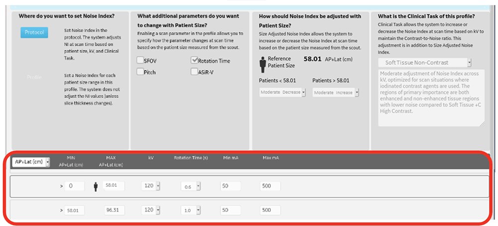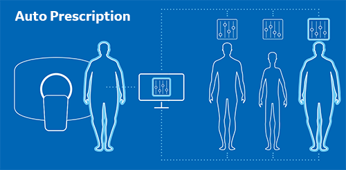 Auto Prescriptionとは、あらかじめ体型に応じてパラメーター(管電圧、最小/最大mA、SFOV、回転速度、ヘリカルピッチ、 ASiR-Vの強度)やNoise Index(以下NI)を設定することでスカウト情報より患者サイズを認識し、自動的に最適な撮影条件が選ばれる機能になります。