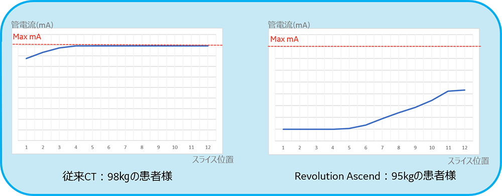 大動脈弓部~肝臓下縁までの管電流の推移。従来CTではピッチ1.375、回転時間0.4秒で撮影、通常Ascendではピッチ1.375、回転時間0.6秒で撮影しておりますが今回Auto Prescriptionにより、自動で回転時間1秒が選択されました。従来CTではほぼ頭打ちしていますが、Ascendでは回転時間の自動調整で頭打ちを防ぐことができていることがわかります。