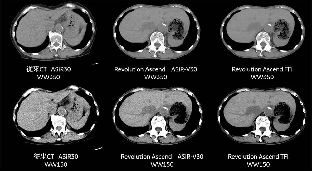 従来CTでは通常NI9.8で撮影しており小さい患者様にも同様のNIのため、コントラストをあげるためにWWを150に絞るとノイジーに感じられますが、Ascendでは通常NIに対しAuto Prescriptionによって自動的にNIが調整されWWを絞ってもノイズの少ない良好な画像を得ることができています。また、TFIを用いることでさらなるノイズの少ない良好な画像を得ることができています。(Fig8)