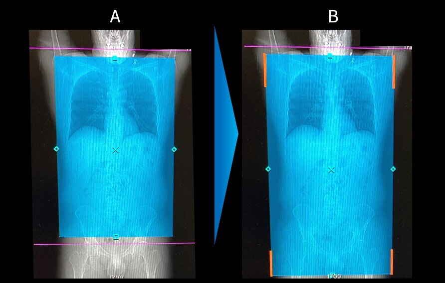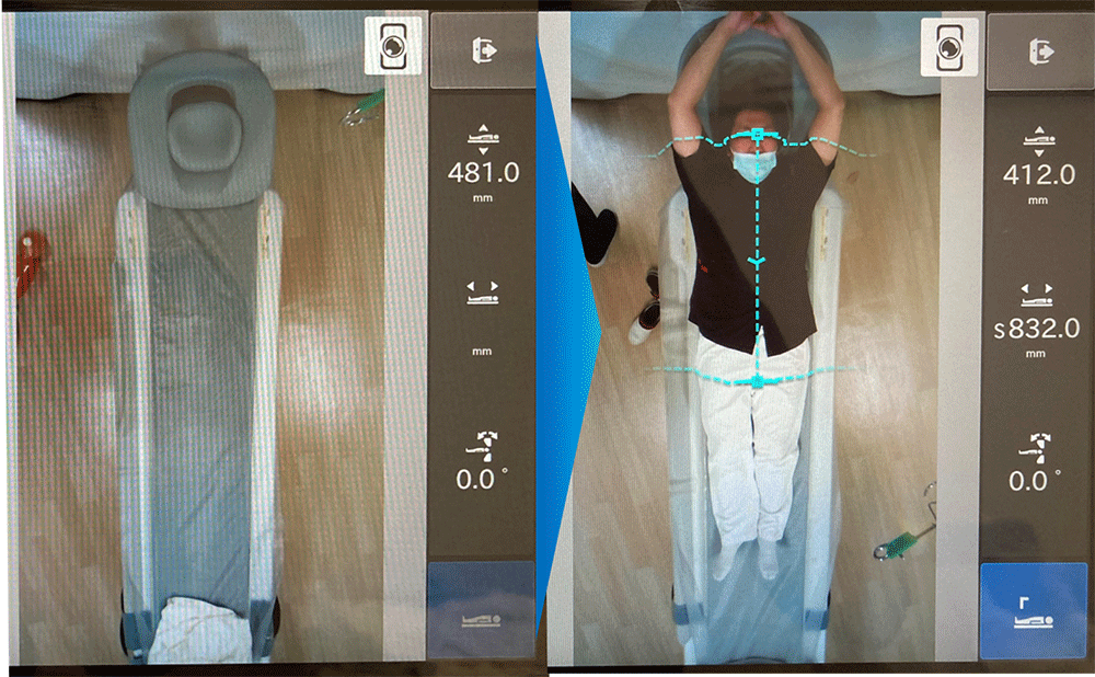 患者が寝台に横になると瞬時に人体を認識し、自動で設定したスカウト撮影範囲が表示される