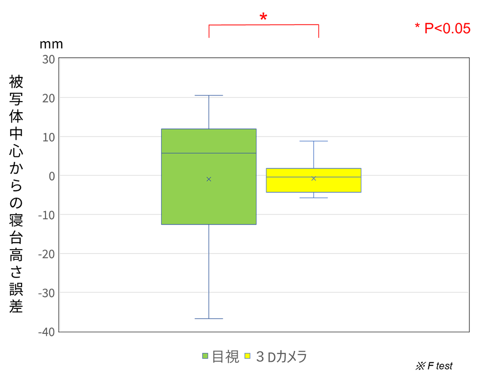 目視による従来のポジショニングでは被写体中心からの誤差が-0.92±16.15 mmであり、DLカメラ導入後では被写体中心からの誤差が-0.77 ±3.74 mmとなり、有意差を持って寝台高さのバラつきが解消されている