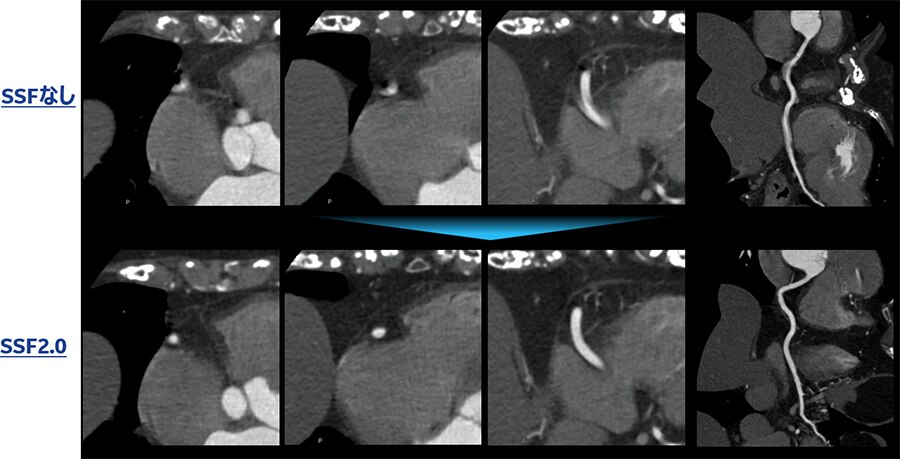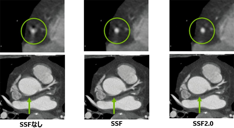導入前は78%や42%など少しでも動きの影響の少ない心位相を検索する必要がありましたが、SSF2.0導入後は位相探索不要な症例が大幅に増えました。そこで、SSF2.0の効果を知るためにSSFなし、SSF、SSF2.0の視覚評価比較を行いました。