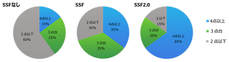 評価可能である3点以上がSSFなしでは40%、SSFで70%、SSF2.0で85%となりました(Fig8)。