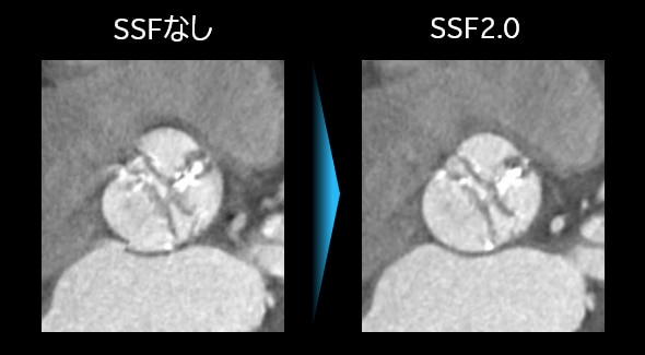 視覚評価の結果、SSF2.0画像はSSFなし(原画像)と比較しモーションアーチファクトは軽減され、ScoreはSSFなし(原画像)では3.4±0.66に対しSSF2.0画像では4.43±0.55となりP<0.01となった。(図5)