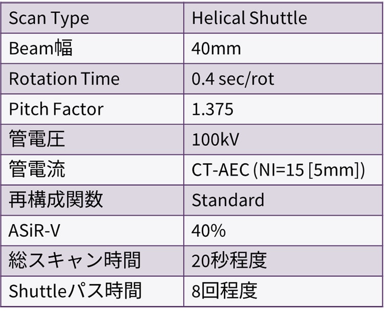 シャトル撮影の特徴として通常の造影CTに比べ、はるかに少ない造影剤量 (通常は100mlのところTest injectionも含め36ml) で撮影が可能な点がある。この症例は待機症例であったためにBAEは後日行ったが、喀血は緊急症例であることが多く、造影CTを撮影した直後にBAEに入ることも多い。その際、造影CTでの造影剤使用量が少なければその分をBAE施行の際使用できるので低造影剤量で検査を行えることもこの撮影法の利点であると考える。