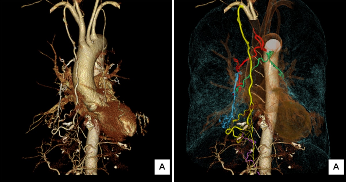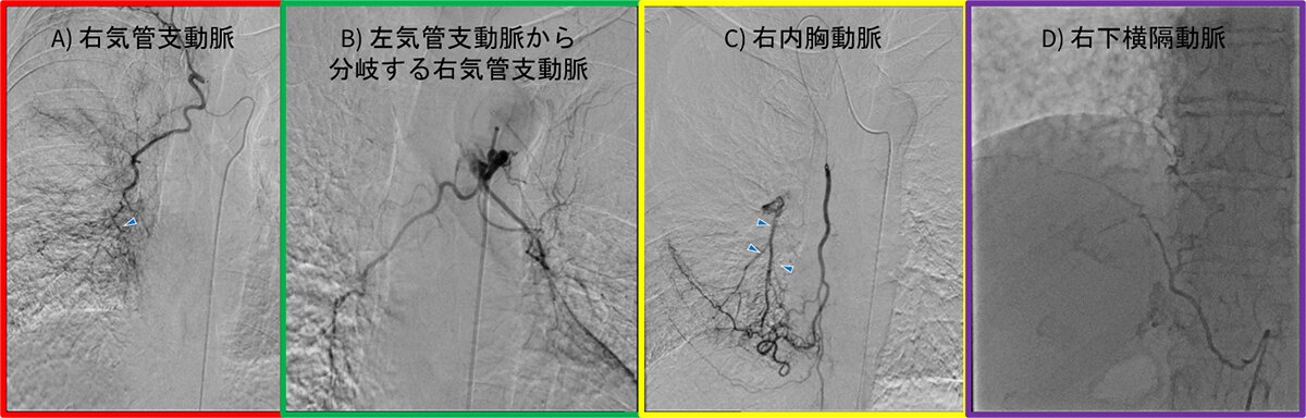 黄:右内胸動脈、赤:右気管支動脈、緑:左気管支動脈から分岐する右気管支動脈、紫:右下横隔動脈、青:肺動脈 (右A5) への造影剤の逆流