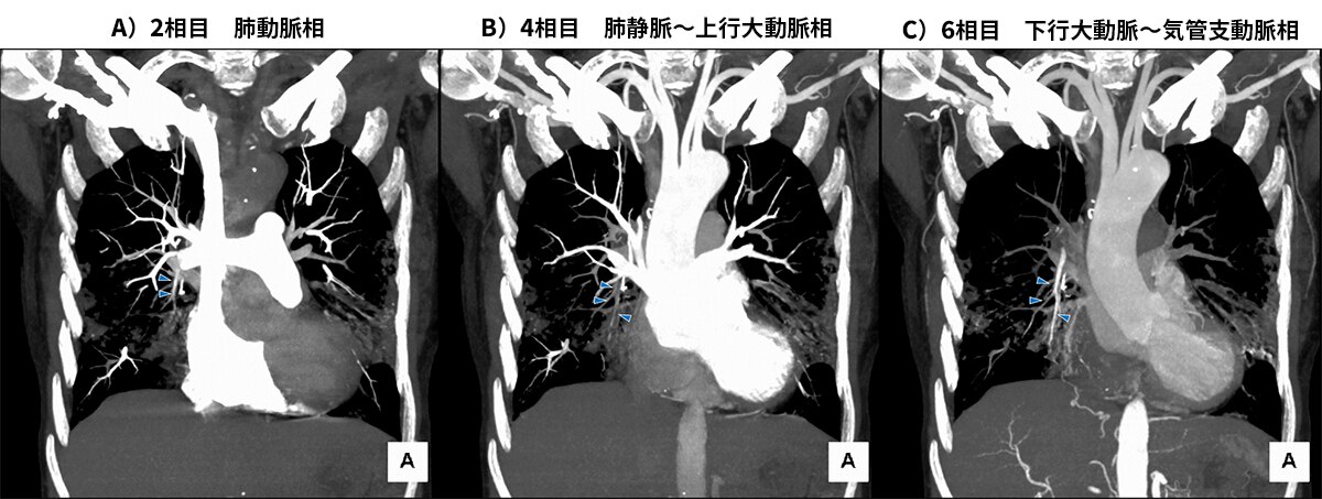 A)の肺動脈相で他の肺動脈よりは弱い造影効果をもつ肺動脈右A5(►)がB)の肺静脈相では造影効果が消失し、C)の下行大動脈相では他の肺動脈と異なり肺動脈右A5に強い造影効果を認める。これは気管支動脈(もしくは他胸郭周囲の体循環系動脈)とのシャント血流があるため、肺動脈相では体循環系からの逆流で他の肺動脈に比べ造影効果がやや低下し、大動脈相で気管支動脈からシャントを経て造影剤が肺動脈に逆流するためである。