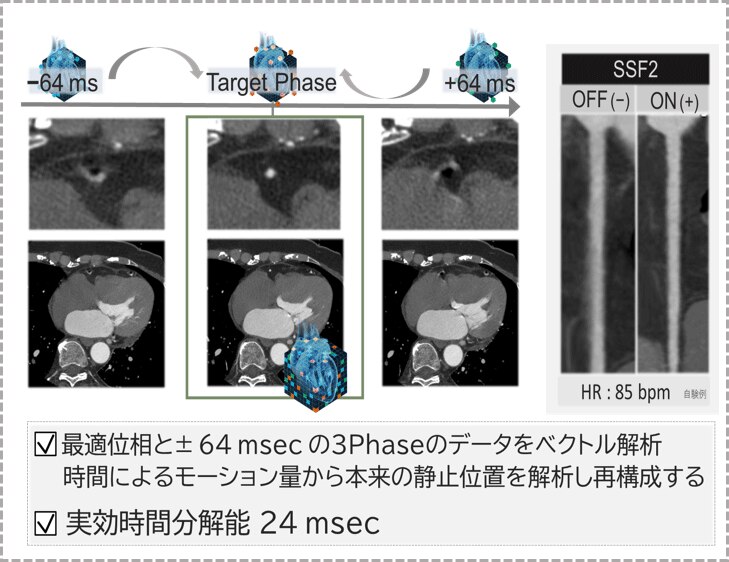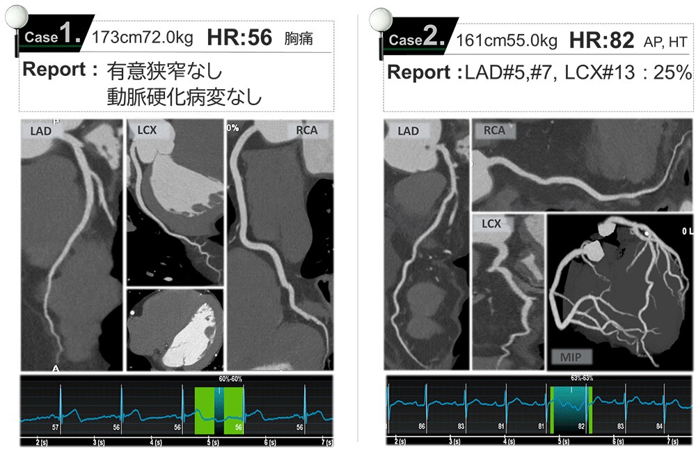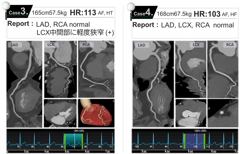 2021年9月から2022年5月の期間に冠動脈CT検査を施行した症例から、現装置導入以前の運用でもβ遮断薬を用いない30例(心拍数:60.3±7.2)をA群、β遮断薬が必要であった高心拍数の34例(心拍数:88.7±12.1)をB群、必要時にβ遮断薬を用いていた af と診断された31例(心拍数:73.9±17.8)をC群とし、心拍数や拍動状態の異なる計95例を抽出し対象とした。ただし冠動脈ステント留置術後、冠動脈バイパス術後、また石灰化を伴う症例を除外した。