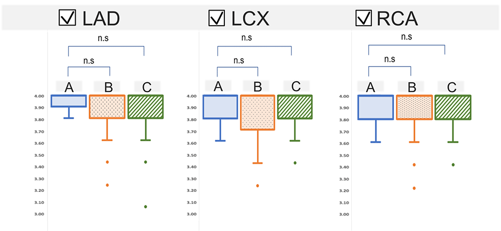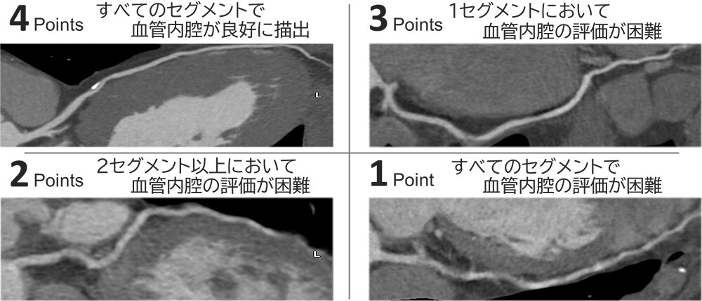 左前下行枝(Left anterior descending artery:LAD)、左回旋枝(Left circumflex artery:LCX)、右冠動脈(Right colonary artery:RCA)のCurved planer reconstruction(CPR)画像について、診療放射線技師6名、循環器内科医師1名で下記の4段階にて視覚評価を行い、A群に対してB群とC群にそれぞれ統計解析を行った。検定はp<0.05を有意とした。