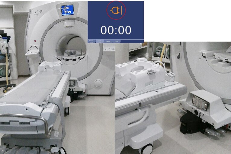 前機種のMRIは寝台が固定式でしたので、患者が汎用ストレッチャーで検査に来た場合、専用ストレッチャーに乗り換えた後MRI室へ入室し、その後さらにMRIの寝台へ移動を行っていました。現在は、脱着式の寝台であるeXpress Dockable Tableを使用することにより、患者を汎用ストレッチャーから直接MRIの寝台へ移動することが可能となりました。患者の移動に費やす作業が2回の行程から1回の行程になったことで、患者入れ替えに掛かる時間が短縮しました。また、MRI検査スタッフ以外の職員が患者移動のために撮影室に入室することが無くなったので所持品の吸着事故が発生していません。