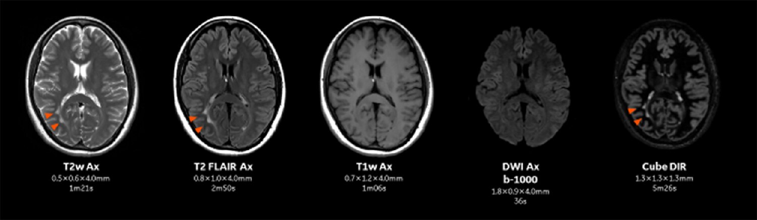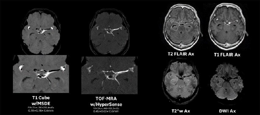 SIGNA Pioneer 3.0T AIR IQ Editionにおける頭部MR検査のプロトコル。従来より薄いスライスで短時間に撮像が可能となっている。