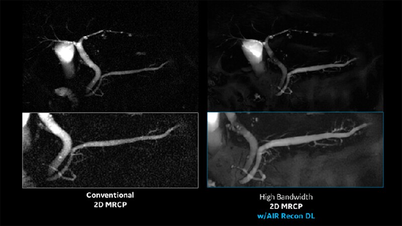 AIR™ Recon DLによりパラメータをHigh Bandwidthに設定が行いやすくなった。臨床的にHigh Bandwidthのインパクトが大きかった検査は、Single shot FSEによる2D MRCPとなる。Single Shot FSEにおけるHigh Bandwidth撮像は、echo spaceが短縮にともないサンプリング時間が短縮されるため、ブラーリングの軽減と併せて微細なモーションアーチファクトの影響を受け難くする。SSFSEにおけるHigh Bandwidth撮像は、患者の息止め得手/不得手にかかわらず動きの影響を低減させて、非常にシャープな画像が得られている。特に2D MRCPでは今まで以上に主膵管や副膵管の形態が良く見えてきており、微細な膵管の狭窄や拡張の有無を捉えられており、末梢膵管の走行の確認や早期膵癌の診断に非常に有用である(Figure.2)。