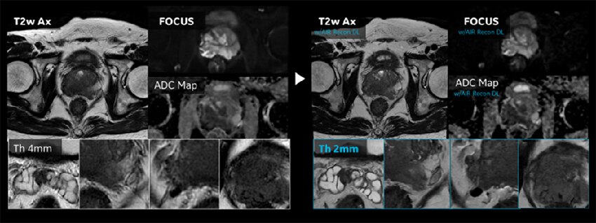 前立腺はAIR™ Recon DLの機能が最も効果的に活用されている領域の一つで、「SNR向上」「Thin slice化」「撮像時間短縮」の3つの恩恵が効率的に得られている。特に前立腺MR診断における重要なコントラストであるT2強調像と拡散強調像の画質向上効果の恩恵が大きい。