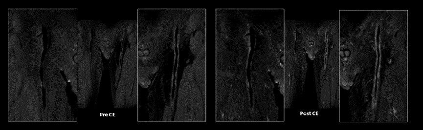 脊椎MRでは矢状断のスライス厚を2.5mmに変更している。脊椎のプロトコルにおいてもThin slice化することで、椎間孔の微細構造が描出され、脊柱管から外側に流れる神経根を連続的に追うことが出来る。