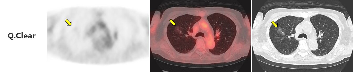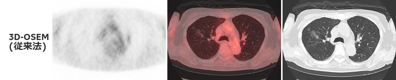 3D-OSEM(従来法)で再構成した画像では、すりガラス像に一致した部位の集積は明らかではありません。Q.Clearを用いて再構成した画像では、淡いながらもすりガラス像に一致した集積が認められます。また、Q.Clearを用いて再構成した画像では、従来法と比べてノイズが低減されています。