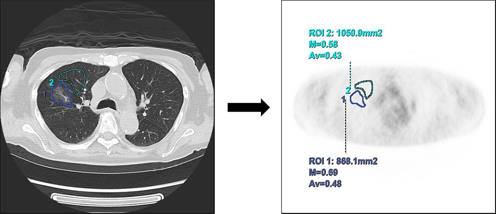 CT上にROIを設定→PET画像上でSUV測定し、病変部と正常部にSUVの差があるかを確認。