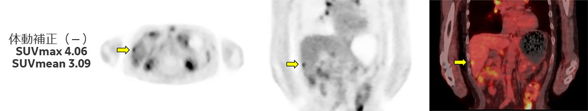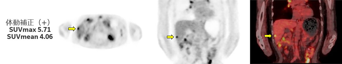 上記とは別症例になりますが(Fig.4)、体動補正を行う事で病変部がより明瞭となっているだけでなく、SUV測定結果では体動補正無しでSUVmax 4.06、SUVmean 3.09だったものが、体動補正を行う事によりSUVmax 5.71、SUVmean 4.06とSUVの上昇も認められています。