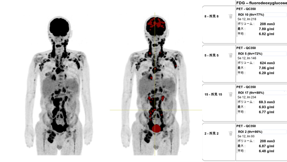 以前使用していたビューワーでは高い集積を複数箇所手動でSUV測定をし、その中でSUVが最大の集積を読影レポートに記載していました。この場合は多くの時間がかかっていましたが、PET VCARを使用することによって読影効率が向上しました。多いときには1日1例程度、悪性リンパ腫の症例があるので、日々有効活用しています。
