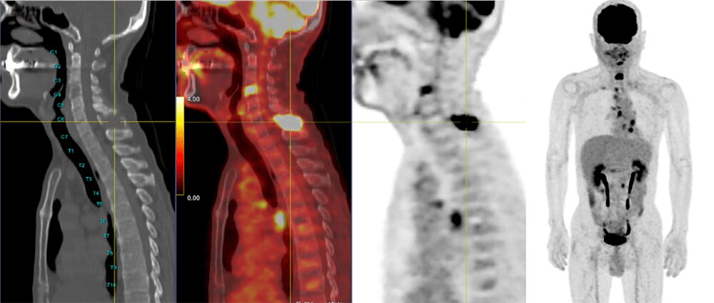 C7(SUVmax=10.28)の棘突起、C4(SUVmax=5.44)椎体等に転移あり