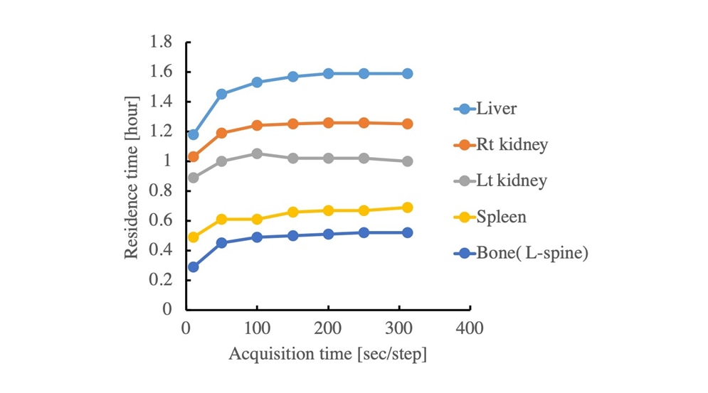 Dosimetry Toolkitに入力するWhole body画像の収集時間は、全て同じであることが求められます。 そこで、dosimetryの精度と撮像時間の関係について検討を致しました。図3は、NM/CT 870CZTで撮像した、111In-ソマトスタチン受容体シンチグラフィ(111In-SRS)のdosimetryにおいて、List modeを用いた後処理により撮像時間を変更させた場合のresidence timeを示しています。本検討により、whole body画像の収集時間がdosimetryに及ぼす影響は小さいことが予想されました。