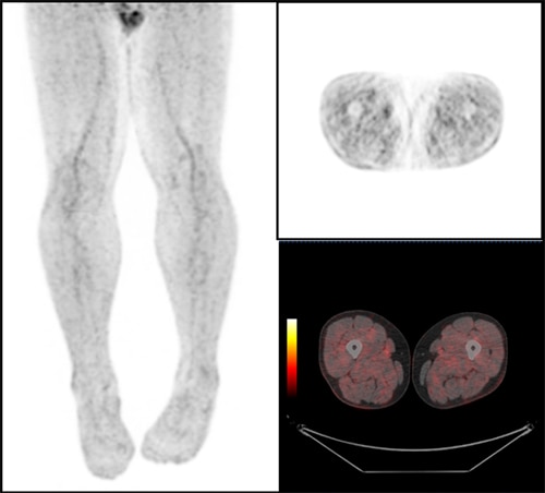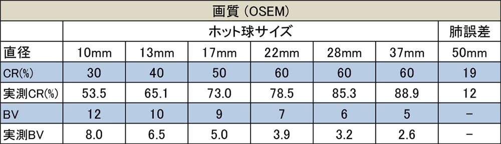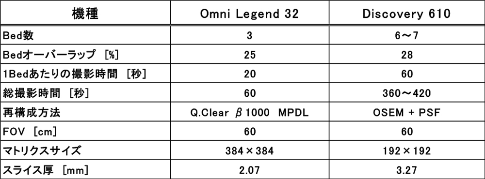 NEMA NU 2-2018に準じて、画質、感度、空間分解能、計数率特性について性能評価を実施しました。その結果、システム感度は 0cm offset 47.30[cps/kBq]、10cm offset 47.05[cps/kBq]、空間分解能は Radial, Tangential, Axial のFWHM[mm]がOSEM再構成@1cmで3.89, 3.73, 3.61 、@10cmで5.10, 3.90, 3.76、計数率特性は、Peak NECR 501.7[kcps], Peak NECR activity 15.70[kBq/ml]、 Scatter fraction at Peak NECR 35.42[%]でした。実測値はいずれもメーカー基準値をクリアしていました(表2, 表3)。他の装置と感度を比較してみると、Omni Legend 32はD610の5倍以上、Discovery MI-25の倍以上の感度を有しているのがわかります(図3、GEヘルスケア資料より)。