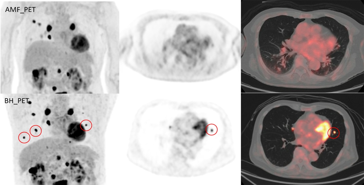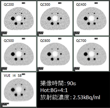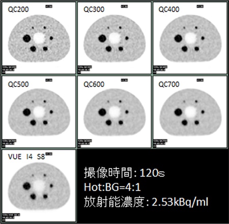 臨床に用いる収集条件は、核医学会が定める「18F-FDGを用いた全身PET撮像のためのファントム試験手順書」に準じたNEMA IEC Bodyファントムによる物理評価と、実際に診断するPET核医学専門医師の視覚評価(図4、図5)により決定しました。運用開始当初は、1bed 120秒撮像、Q.Clear β400で再構成を行っていましたが、収集時間をもう少し短く出来るのではないかと考え再検討し1bed 90秒撮像、Q.Clear β500の再構成としました。Precision DL(PDL)は、元の画像の特徴を大きく変えずにノイズが除去できるMediumを使用しています。