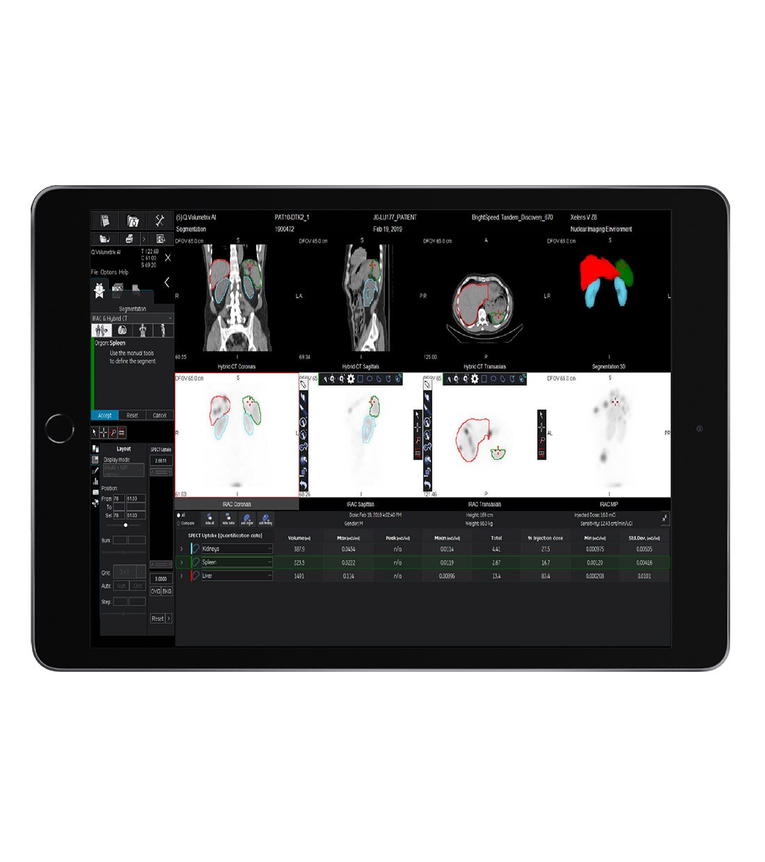 8 Xeleris 4 DR Q.Volumetrixを使用した場合と、手動または外部ソフトウェアによる線量計算を比較。5件のSPECT-CT症例を使用したベンチテストで実証。ベンチテストでは、データの読み込みからユーザーが事前定義した式を使用した線量計算までのワークフローをカバーしました。結果は異なる場合があります。